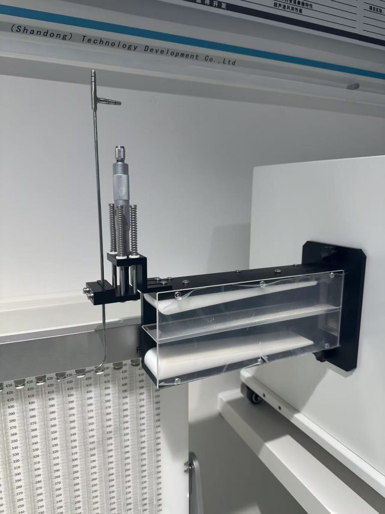 该模块正面可视透明,流道中间嵌入隔板,可自由翻转及更换,通道的上下两端布置的白色内衬板可调转,可让流道在来流方向上形成上升或下降的压力梯度;设备带有微型毕托管,用千分尺调控竖直方向的位移,可测量出边界层在板上沿流动方向上的厚度分布;根据伯努利方程,通过多管压力计测量的总压和静压,可计算出边界层内的速度分布。
