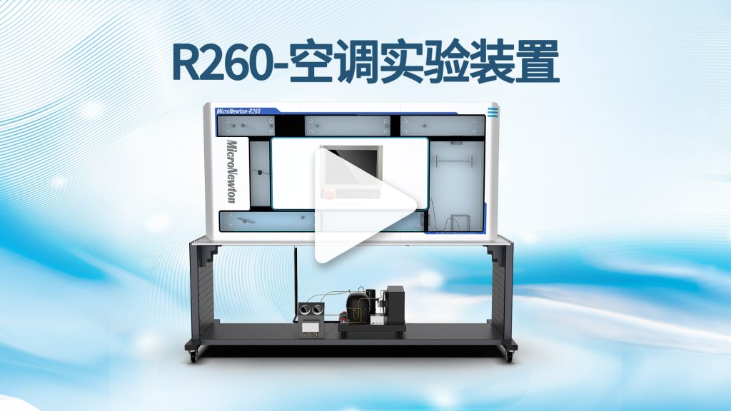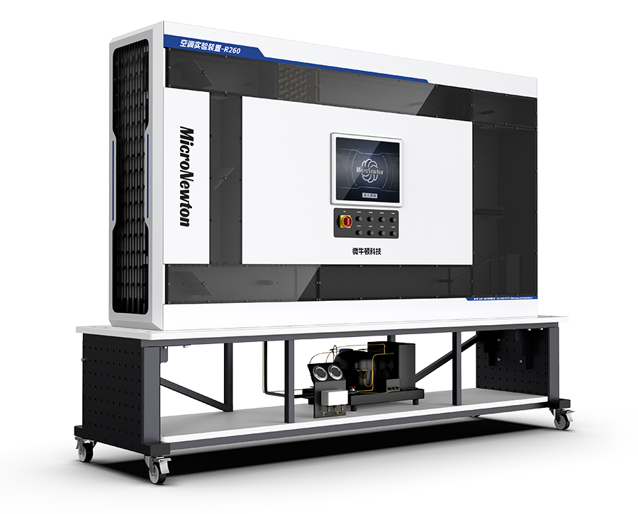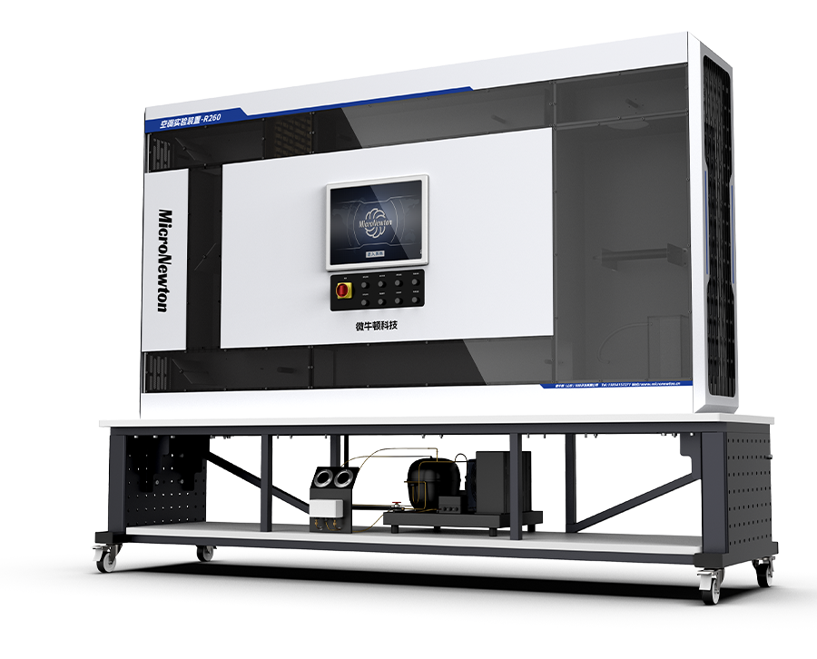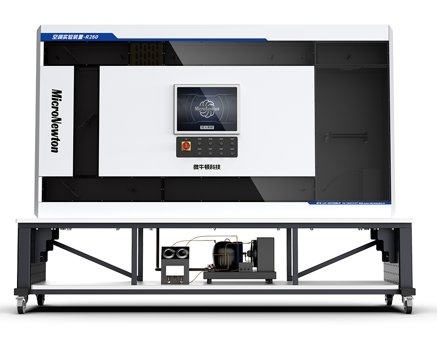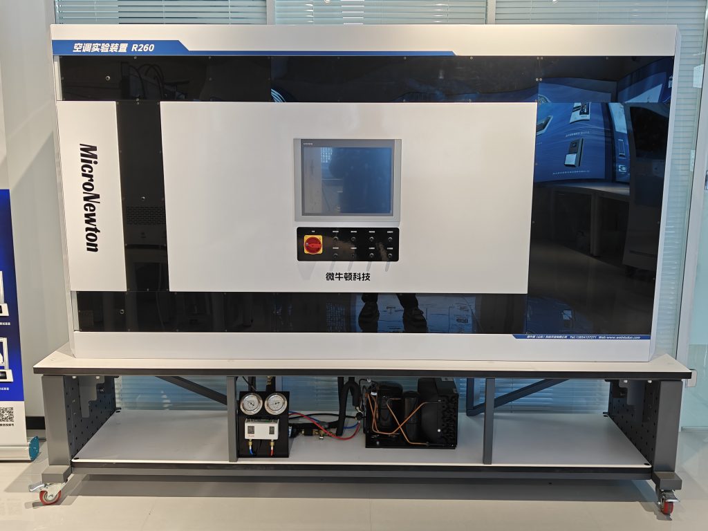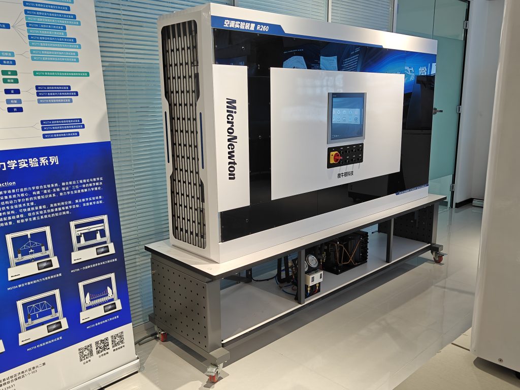 屏幕具有实验数据、实时曲线显示等多项功能,其中实验数据显示包括:每个过程前后的空气温度、湿度,加热功率,空气压力,制冷剂压力和流量,压缩机电压和电流,风扇电压等。