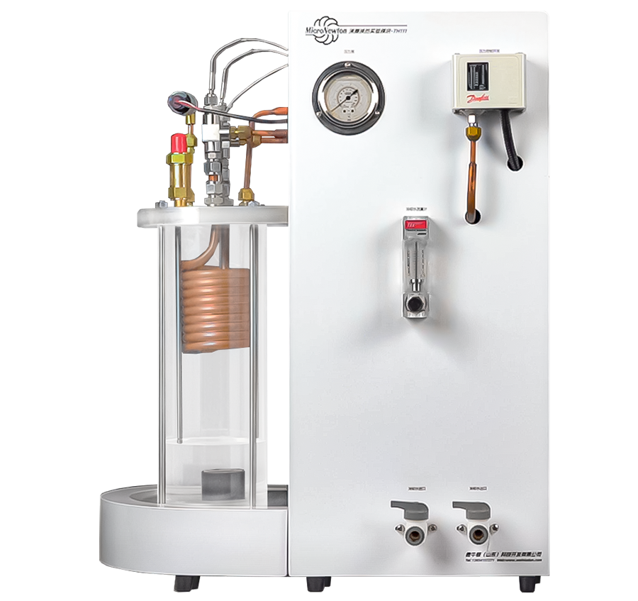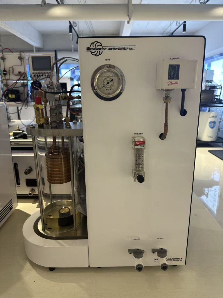 该设备的主体为一个透明的石英玻璃容器,容器的底部为电加热装置,顶部为水冷装置,容器内盛有一定量的低沸点有机溶剂,配套恒温水浴以提供冷却水,通过传热学基本实验台测量相关实验参数。